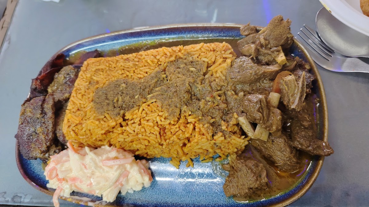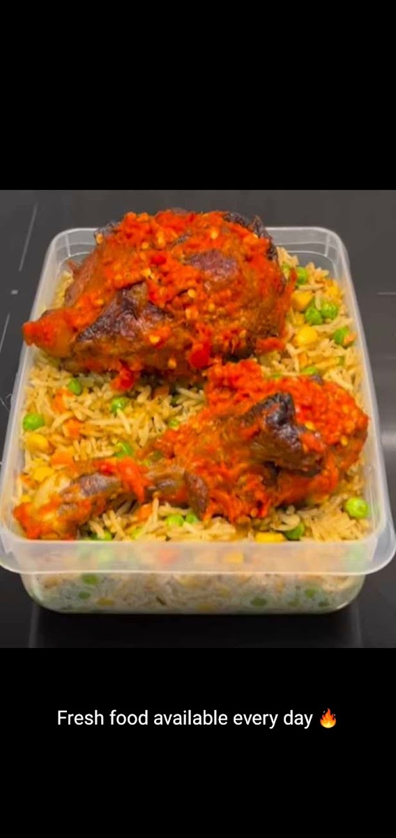 “If you're looking for a really nice experience this is a great place. The chef is very friendly and positive. I was walking down mulberry junction looking for a place to eat( I was starving ) I came across the sign the chef came out and was like come in if you're hungry, I was like you know what yeah let's try this spot ! I asked the chef for his recommendation Banger, I had the jolof rice , jerk chicken and plantains. The rice was fluffy and spicy, the chicken falling off the bone, plantains were nice and sweet thanks to the sauce. The Nigerian fanta was really interesting, I had not tried it before was cool. The atmosphere was fun, Bob Marley music was playing what more could I ask for?”